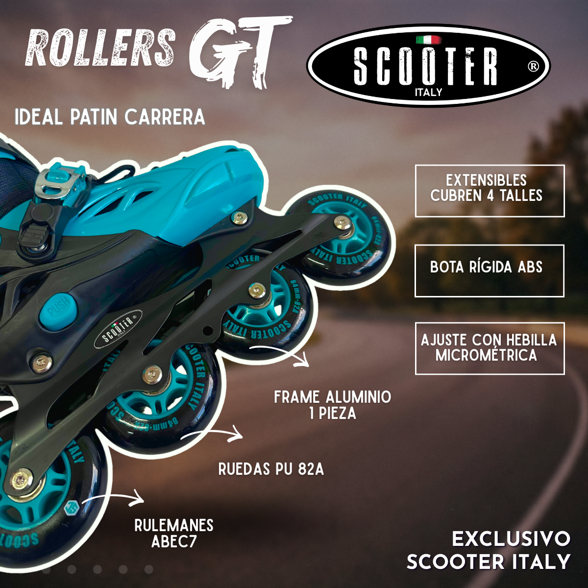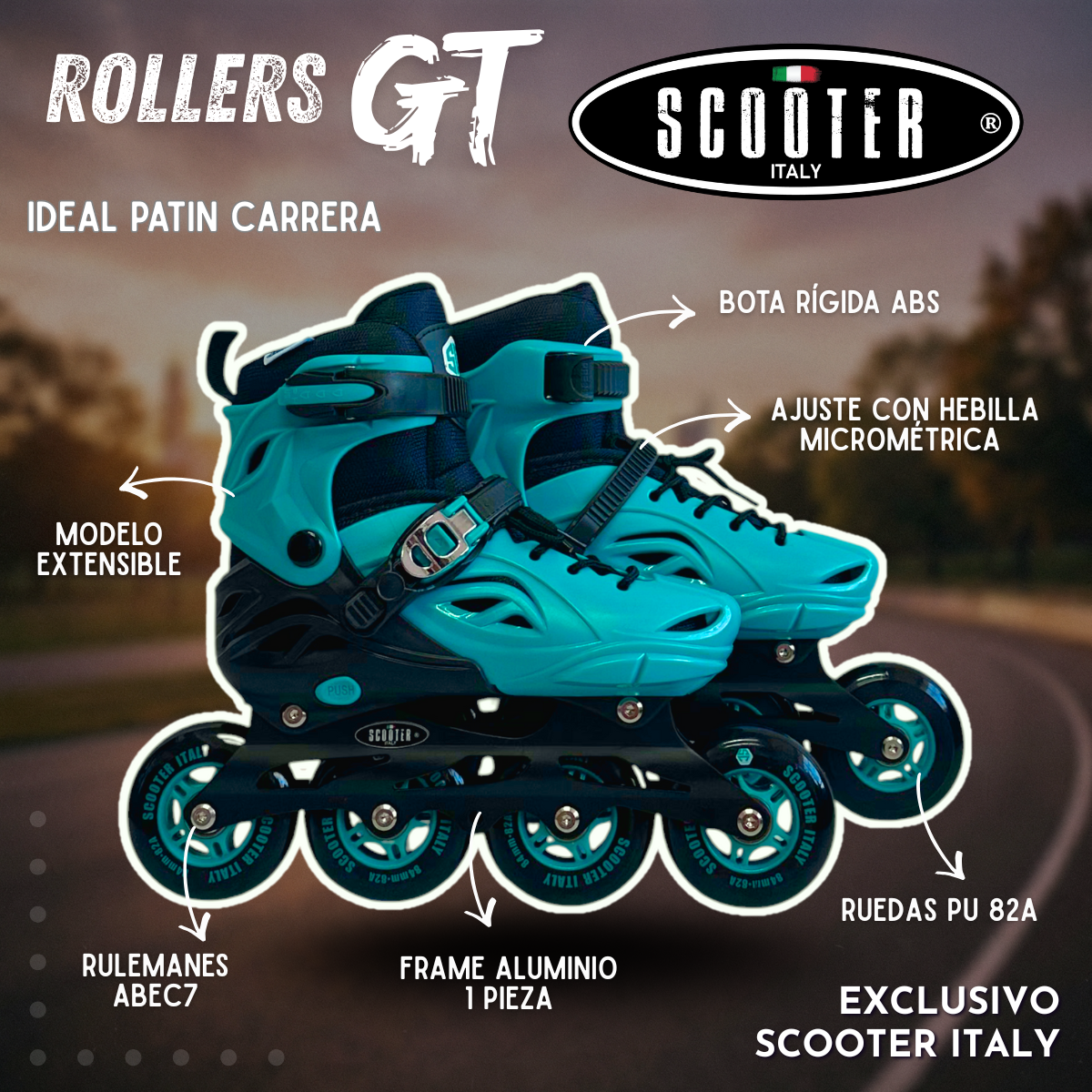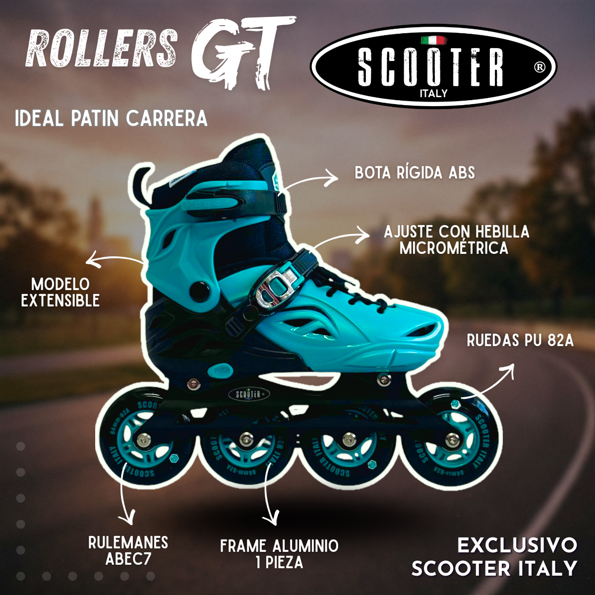 Los Rollers GT de Scooter Italy® están diseñados para quienes buscan llevar su patinaje al siguiente nivel. Pensados como patín carrera / fitness urbano, combinan estructura profesional, deslizamiento fluido y un sistema extensible inteligente que acompaña el crecimiento del usuario. Son ideales tanto para quienes están aprendiendo con seriedad como para riders que exigen rendimiento real en cada salida.